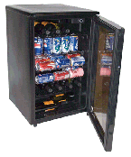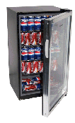 HC125FVS Our price: $277.00 • Glass Door with Black Cabinet & Metal Door Trim • Automatic Interior Light • 4 Full Width Black Vinyl Coated Wire Shelves • Flip Shelf for Tall Bottle • Recessed Handle • Security Lock and Key • Adjustable Thermostat • Reversible Door • Auto-Defrost • Removable Lower Bottle Rack
