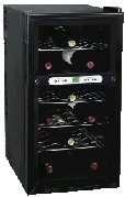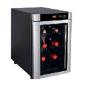 HVUE06ABS Our price: $149.00 • Up to 6 Bottle Capacity Electronic Control • Perfect for both Red and White Wines • Double Pane Insulated Glass Door with Silver Trim/black cabinet • Adjustable Thermostat Control Soft Interior Light • 3 Full Width Chrome Wire Storage Racks • Black Interior • Ultra Quiet Thermal Electric Cooling